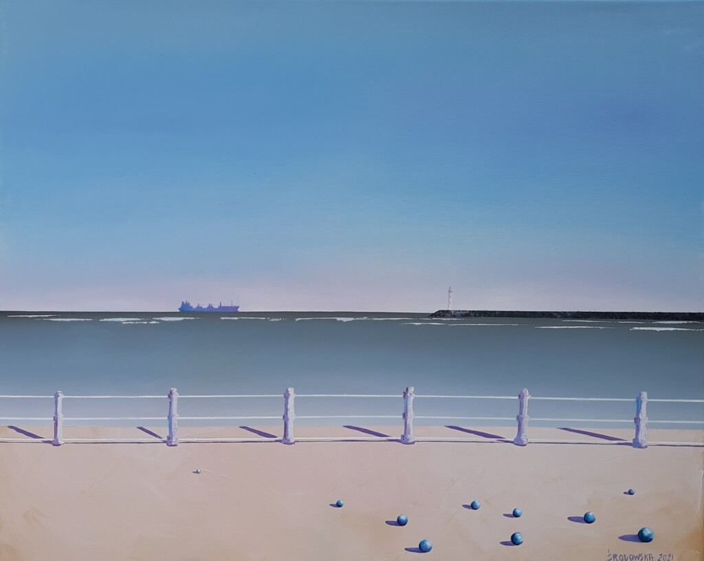 W obrazach figuratywnych pojawiają się oszczędne pejzaże i ludzkie sylwetki rozmieszczone na obrzeżach kompozycji, zapraszające do kontemplacji. W pracach geometrycznych – często z centralnie umieszczonym kwadratem – artystka tworzy wrażenie zawieszenia i transcendencji, gdzie forma staje się nośnikiem głębszych znaczeń.