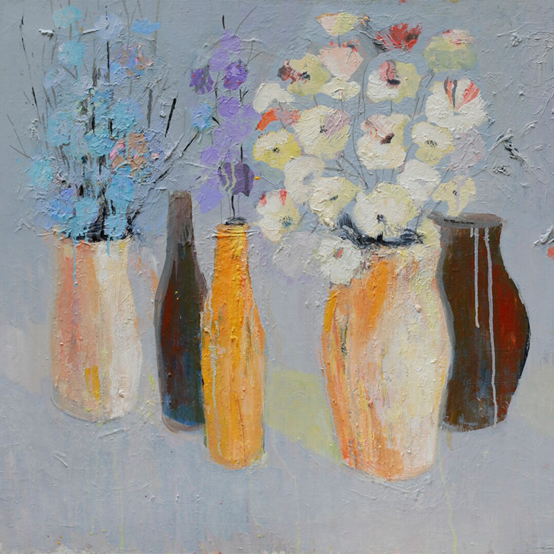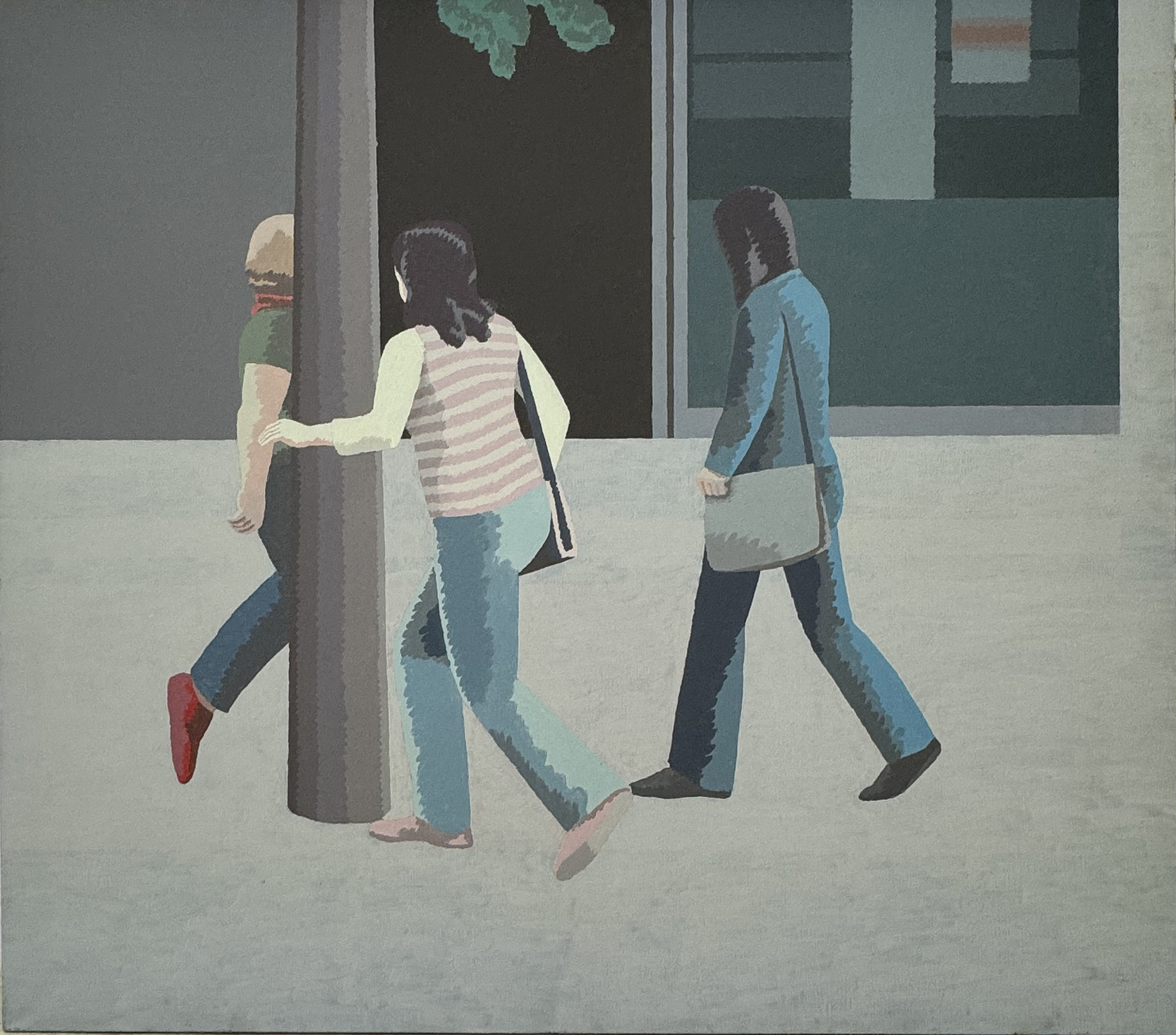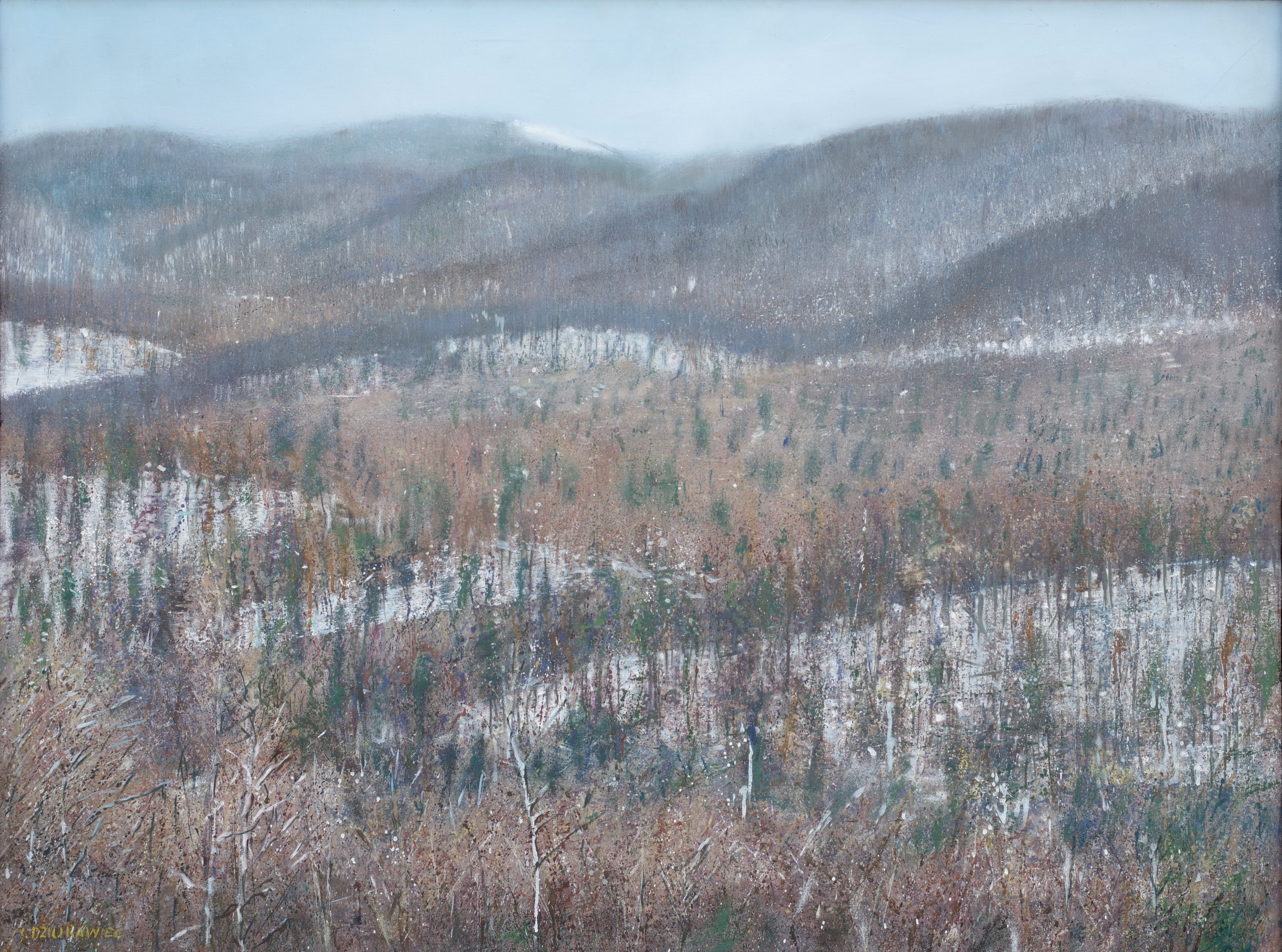 Abstrakcyjny obraz w odcieniach szarości z miękkimi, falistymi formami przypominającymi zwiniętą tkaninę lub skały.