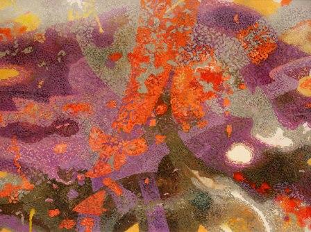 Abstrakcyjny obraz w odcieniach czerwieni, przedstawiający spiralną, organiczną formę z otworem pośrodku, przypominającą muszlę.